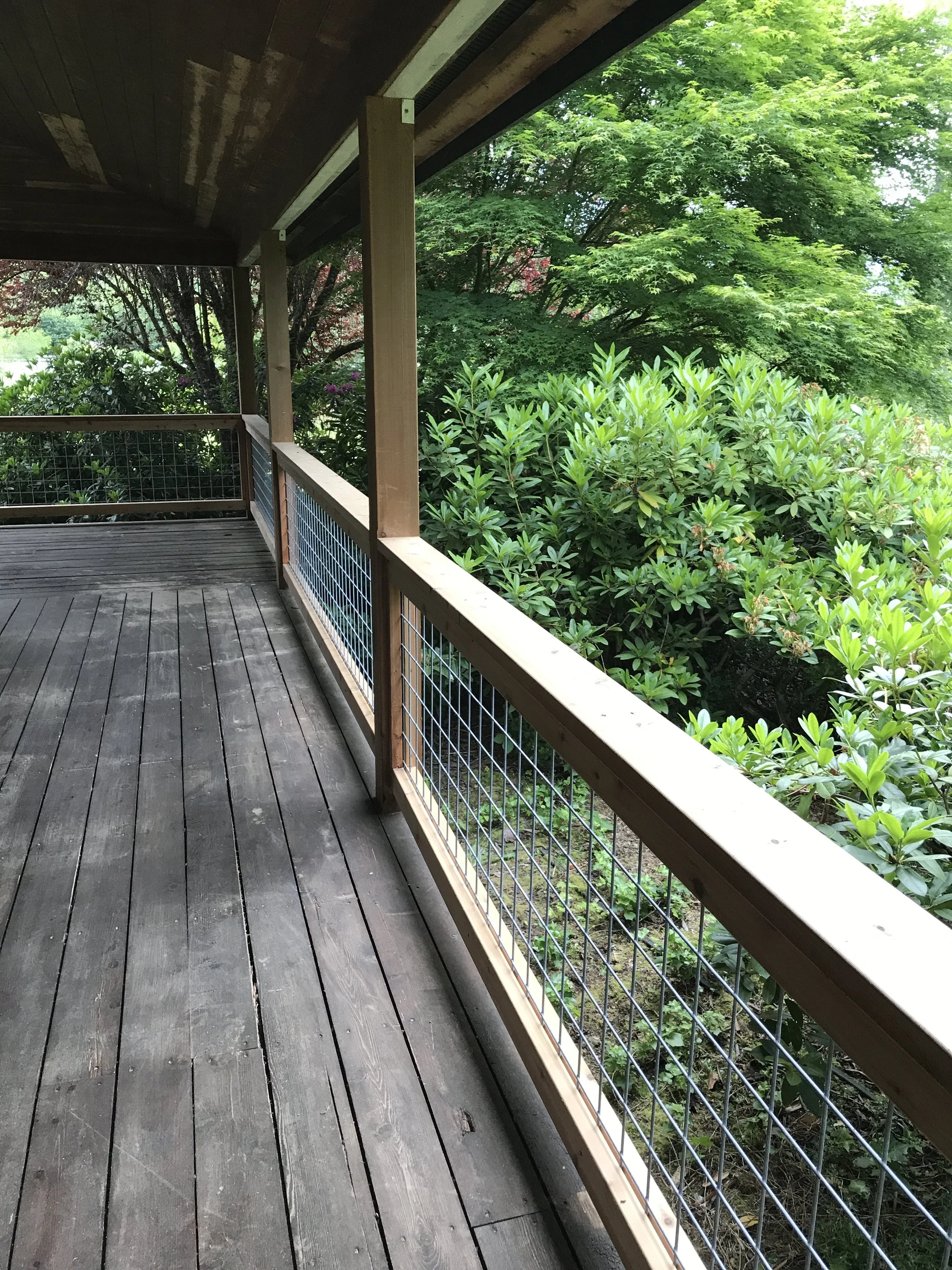 Our basic railing consists of either cedar or pressure treated fir 4x4 posts through-bolted to your deck frame, 2x4 top and bottom rails and a 2x6 top, and 2x2 pickets. It is a durable, attractive railing that is a big step up from the basic railing from the other guys.